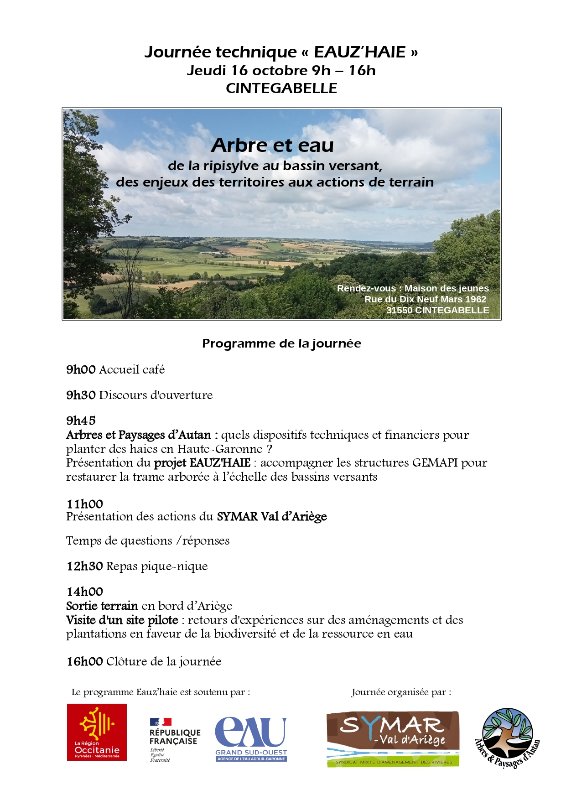 Dans le cadre du programme EAUZ’HAIE à destination des structures GEMAPI, l’association Arbres et Paysages d’Autan a le plaisir de vous inviter à la journée technique "Arbre et Eau, de la ripisylve au bassin versant", organisée en partenariat avec le SYMAR Val d’Ariège.